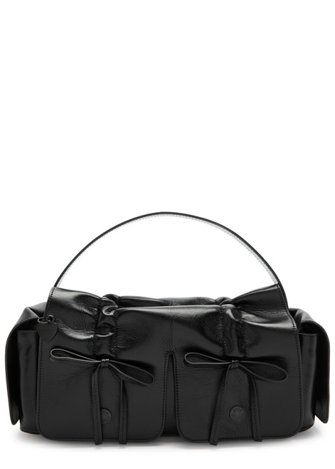 Logo-embossed top handle, heart hanging charm, designer-engraved hardware, ruched details with bow trims at front, magnetic-fastening flap patch pockets at sides, internal slip pocket, fully lined